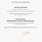 Mikołaj Zabawski – uczeń klasy VIII – finalista Małopolskiego Konkursu Geograficznego;