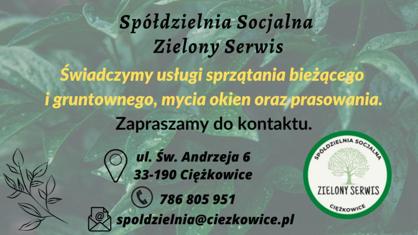 Spółdzielnia Socjalna Zielony Serwis powstała w czerwcu 2022 r. Zatrudnia ona osoby zagrożone wykluczeniem społecznym i zawodowym z terenu gminy Ciężkowice i spełnia w ten sposób założenia projektu unijnego.