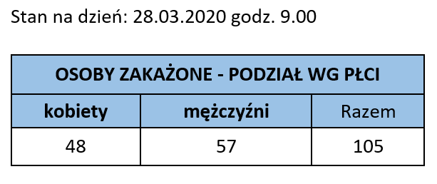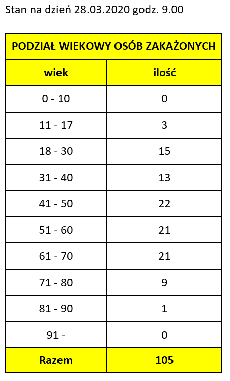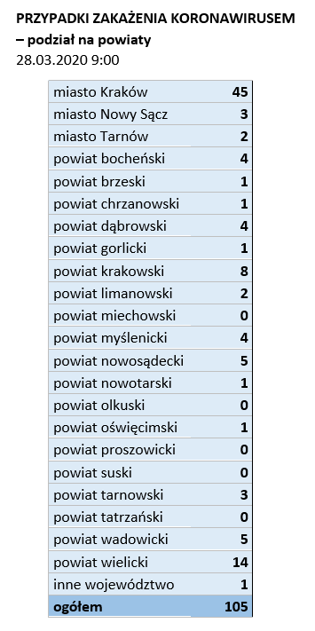 28 marca 2020 r. o godzinie 9:00 rano w Małopolsce mieliśmy 105 potwierdzonych laboratoryjnie przypadków zakażenia koronawirusem SARS-CoV-2. Najmłodsza zakażona osoba ma 12 lat, najstarsza 83 lata. Najwięcej zakażonych pochodzi z Krakowa (45 osób), powiatu wielickiego (14 osób) i powiatu krakowskiego (8 osób). Największą grupę wśród zakażonych stanowią osoby w przedziale wieku 41-50 lat, a także 51-60 i 61-70 lat (odpowiednio: 22 i po 21 osób). Wśród 105 potwierdzonych przypadków jest 57 mężczyzn i 48 kobiet.