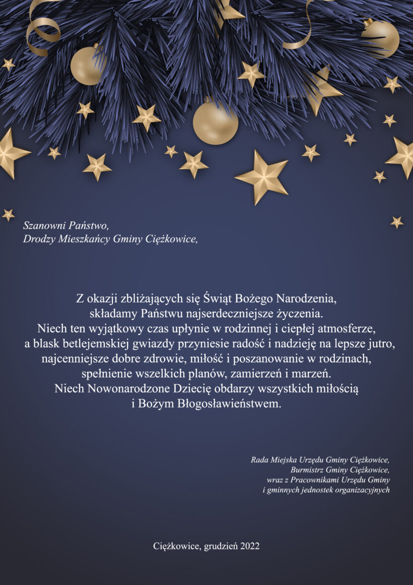 Życzenia świąteczne składają: Radni Rady Miejskiej w Ciężkowicach, Burmistrz Gminy Ciężkowice, Kierownicy oraz Pracownicy wszystkich jednostek organizacyjnych Gminy Ciężkowice.